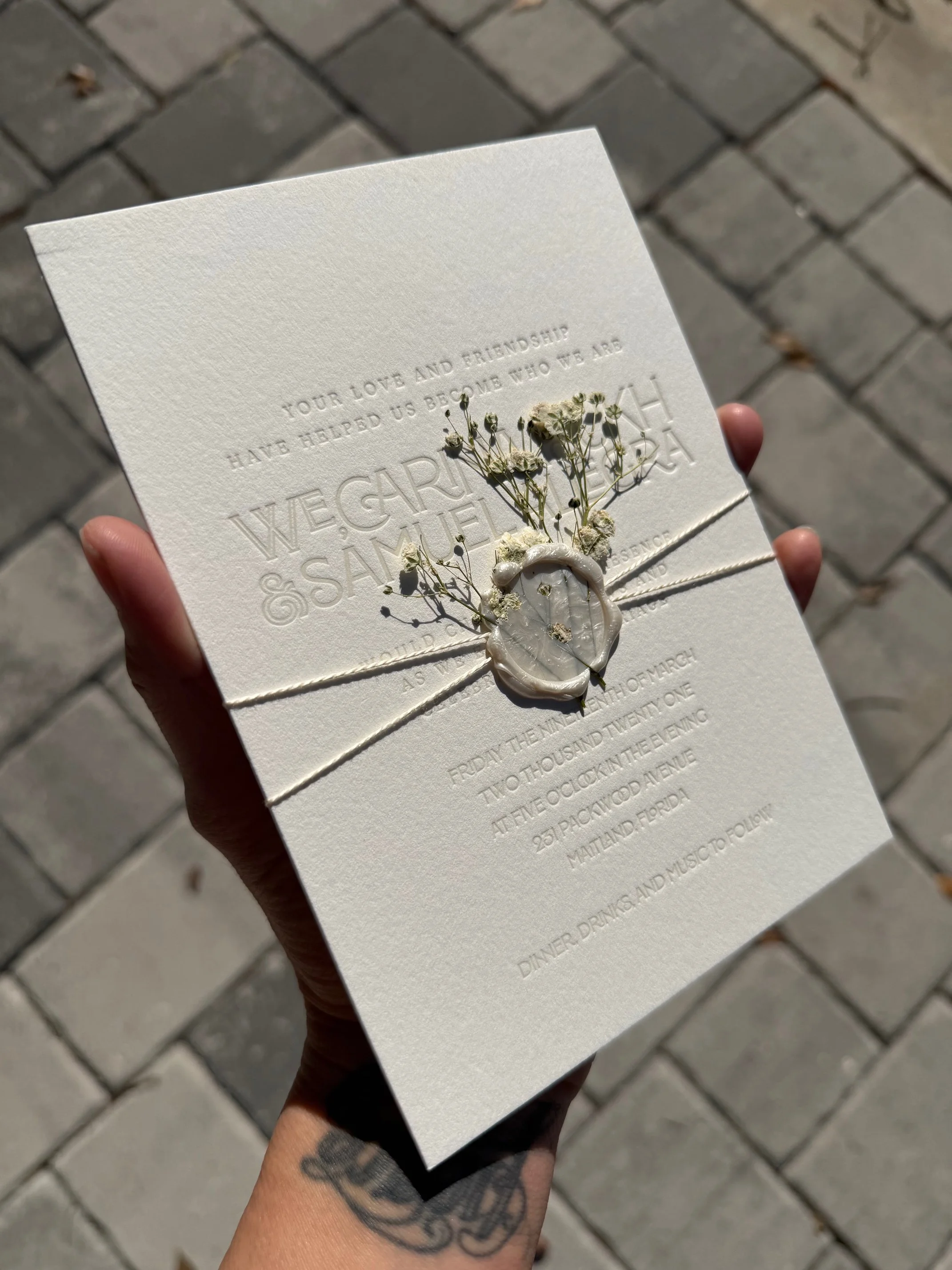 White—on—White Letterpress Wedding Invitation with white florals and wax seal