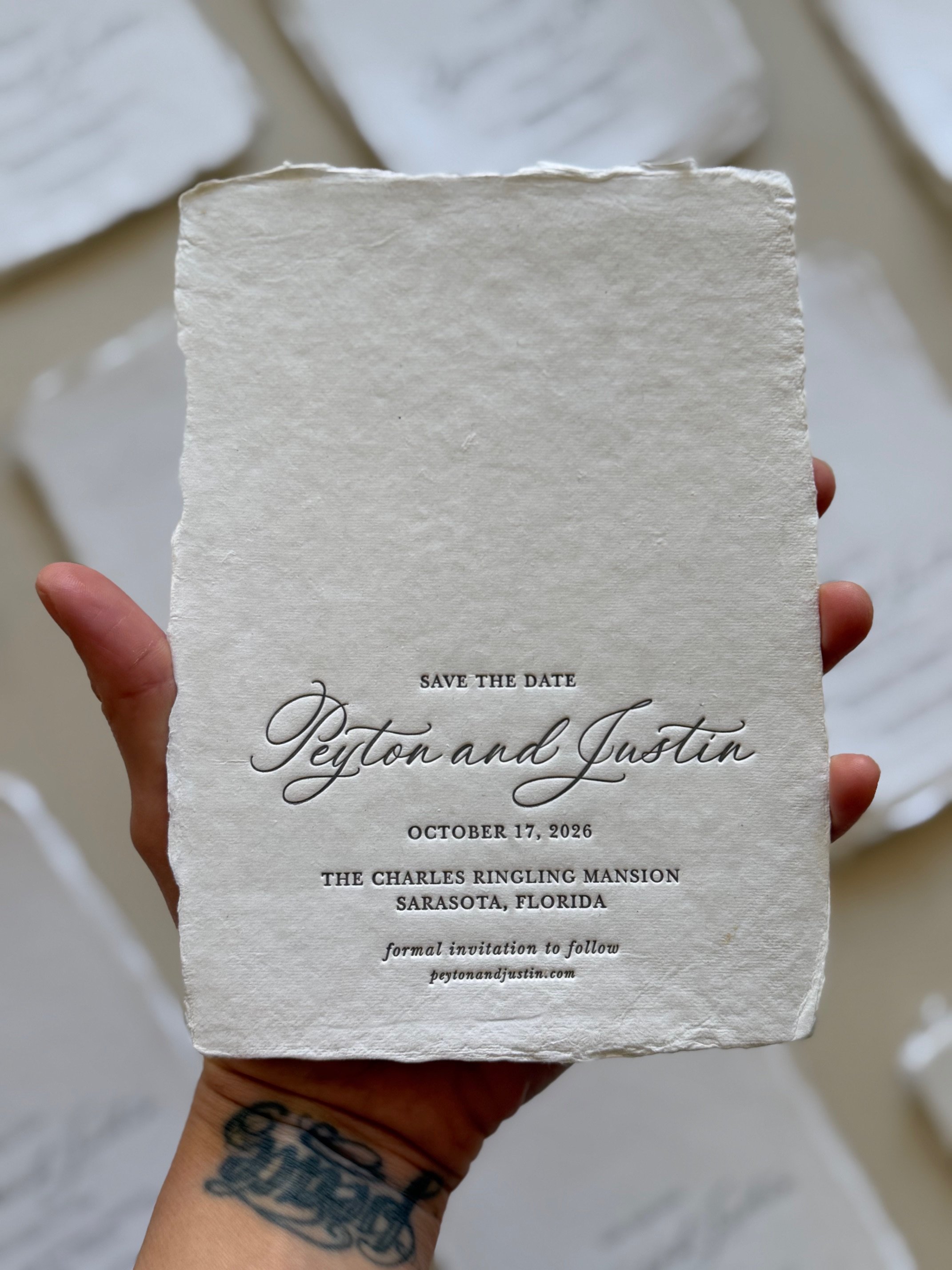 Each sheet of handmade paper is formed individually, resulting in natural deckled edges, subtle texture, and variation from piece to piece. No two invitations are exactly alike, which makes this paper especially appealing for: