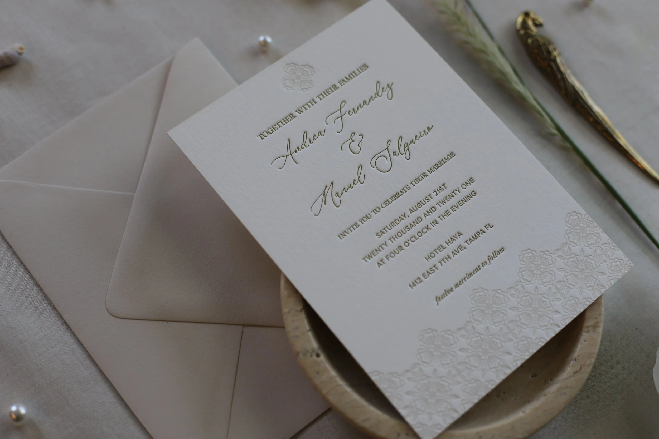 Gold ink produces a soft, matte finish. It leans understated and refined, perfect for couples who want something classic without too much shine. When pressed into cotton paper using letterpress, it creates a subtle impression that feels tactile and artisanal.