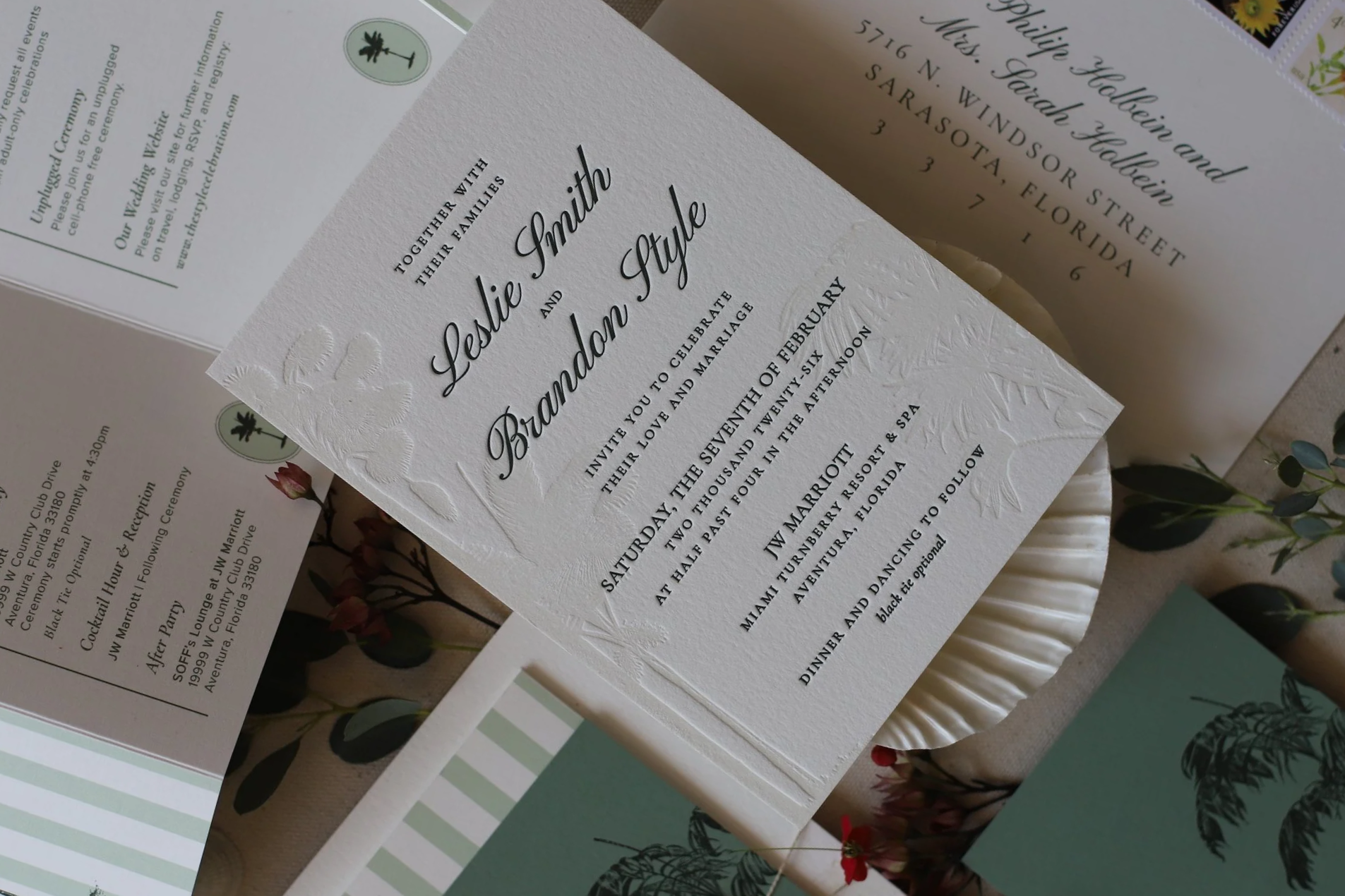 Upon meeting with Leslie, a stunning & fun Brazilian bride, I instantly knew her invitations were going to be elegant Florida black tie with a fun modern flare. The stripe pattern on their weekend details insert came from inspo originally meant to highlight their pickleball themed Welcome Party. Unfortunately the venue wasn’t able to revamp the pickleball courts in time for their wedding BUT that didn’t mean we had to let go of this extra fun design element. The brides colors incorporated beautiful sage details that we carried into the paper tones and custom ink colors. The invitation uses a 2-color letterpress design. The first layer, delicate letterpress palm tress, was printed with our signature white de-boss technique, while the second layer was pressed with a hand mixed deep green ink. Topped off with budget-friendly sage green envelope liners. The cherry on top? Everything was tied together with pearl jute and their custom letterpress monogram on a die-cut oval.